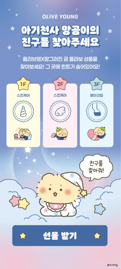 스탬프 투어는 단순히 특정 위치를 방문하는 것이 목적이라면 금방 지루해질 수 있는데요. 하지만 이번 올리브영 이벤트에서는 "아기천사 망곰이가 잠든 사이 사라진 친구를 찾아달라"는 귀여운 스토리텔링을 입혀졌기 때문에 ‘발견의 즐거움’을 느낄 수 있다는 게 가장 큰 특징입니다.